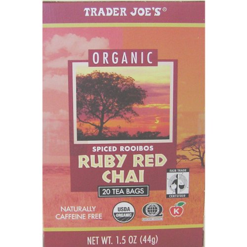 Trader Joe's Organic Spiced Rooibos Ruby Red Chai Tea 20 Bags/box (Pack of 4) Trader Joe's Organic Spiced Rooibos Ruby Red Chai Tea. We've blended a variety of spices from around the world for this wonderful cup of Ruby Red Chai. Made from south African Rooibos, naturally caffeine free, this tea is chock full of antioxidants and warms the body, soothes the mind and heals the soul. Enjoy this full bodied tea on its own or add milk and sweeten if desired. Read more